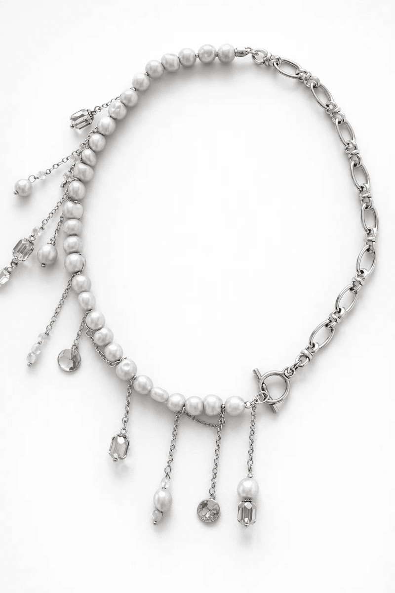 Чокер із сірих перлин та ланцюжків з багатьма підвісками.