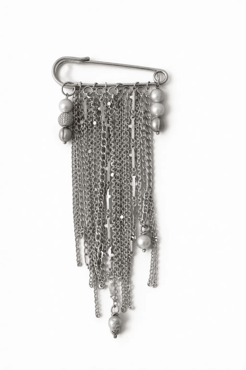 Брошка срібляста з ланцюжків та сірих перлин. 55 €