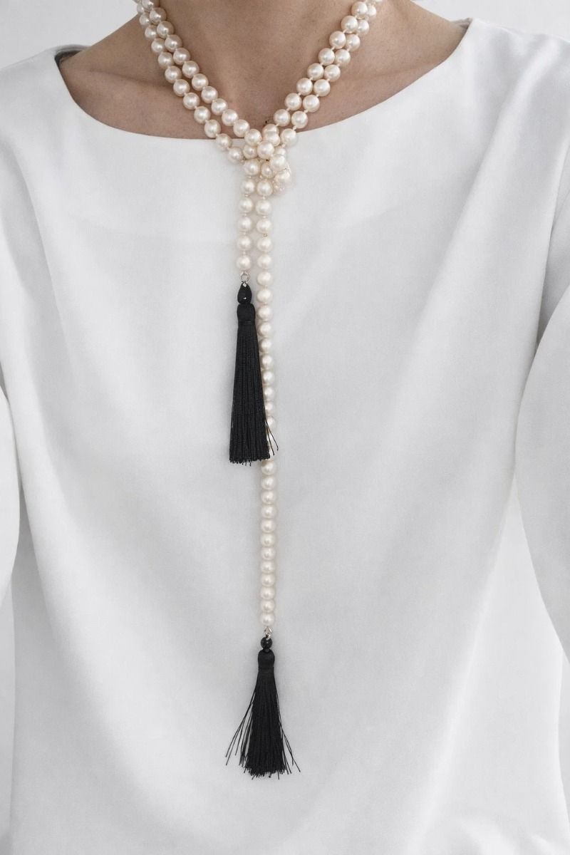 Вишуканий лариат довжиною 120 см з блискучих натуральних прісноводних перлів 8 мм з ефектними чорними китицями на кінцях. Цю універсальну прикрасу можна носити як довге намисто, обгорнути подвійно, зав'язати вузлом або накинути як пояс. Контраст білих перлів і чорних китиць створює сміливий, витончений образ.