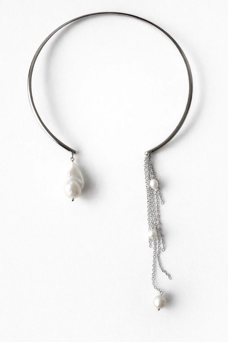 Чокер жорсткий, має 2 асиметричні кінця з перлин. 115 €