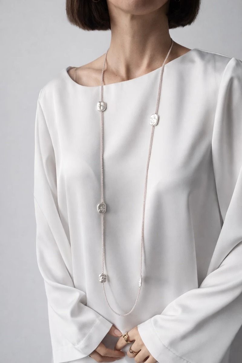Ніжний сотуар довжиною 120 см, що поєднує блискучі намистини рожевого циркону з натуральними прісноводними перлинами. М'який рожевий відтінок циркону в парі з класичним сяйвом перлів створює жіночну, романтичну композицію. Ідеально для шарування або носіння одним довгим рядком.